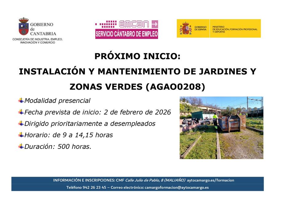 | 19/1/2026 | INSTALACIÓN Y MANTENIMIENTO DE JARDINES Y ZONAS VERDES | De 02/2/2026 hasta 30/6/2026 |